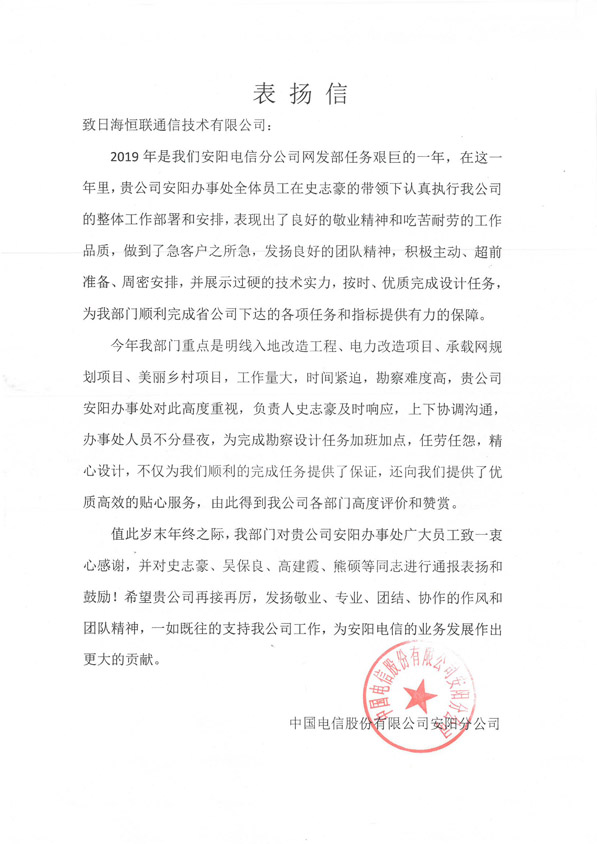 轉(zhuǎn)發(fā)“中國(guó)電信股份有限公司安陽(yáng)分公司”對(duì)我公司員工的一封表?yè)P(yáng)信